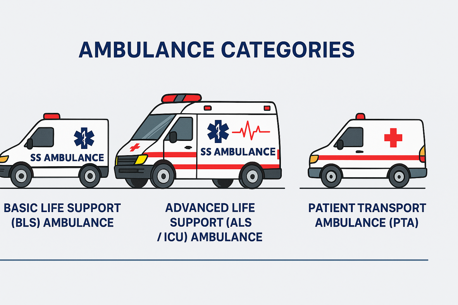 BLS Ambulance: Equipped with basic life support (oxygen, stretchers, first aid). ALS Ambulance: Advanced ICU support including ventilator, defibrillator, ECG monitor, and emergency medications for critical patients.